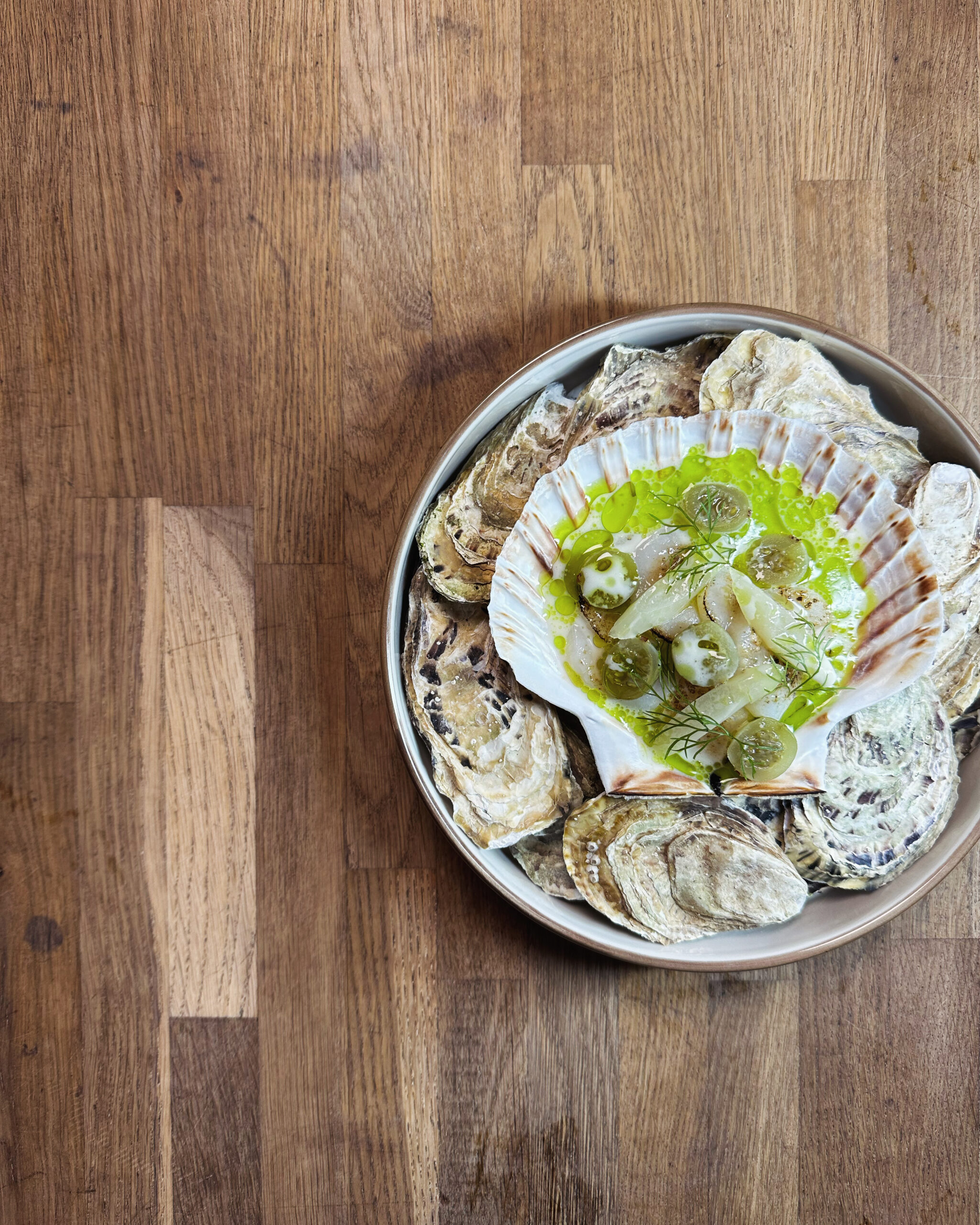 Rå kammuslinger, fermenterede hvide asparges, persilleolie, syltede stikkelsbær,