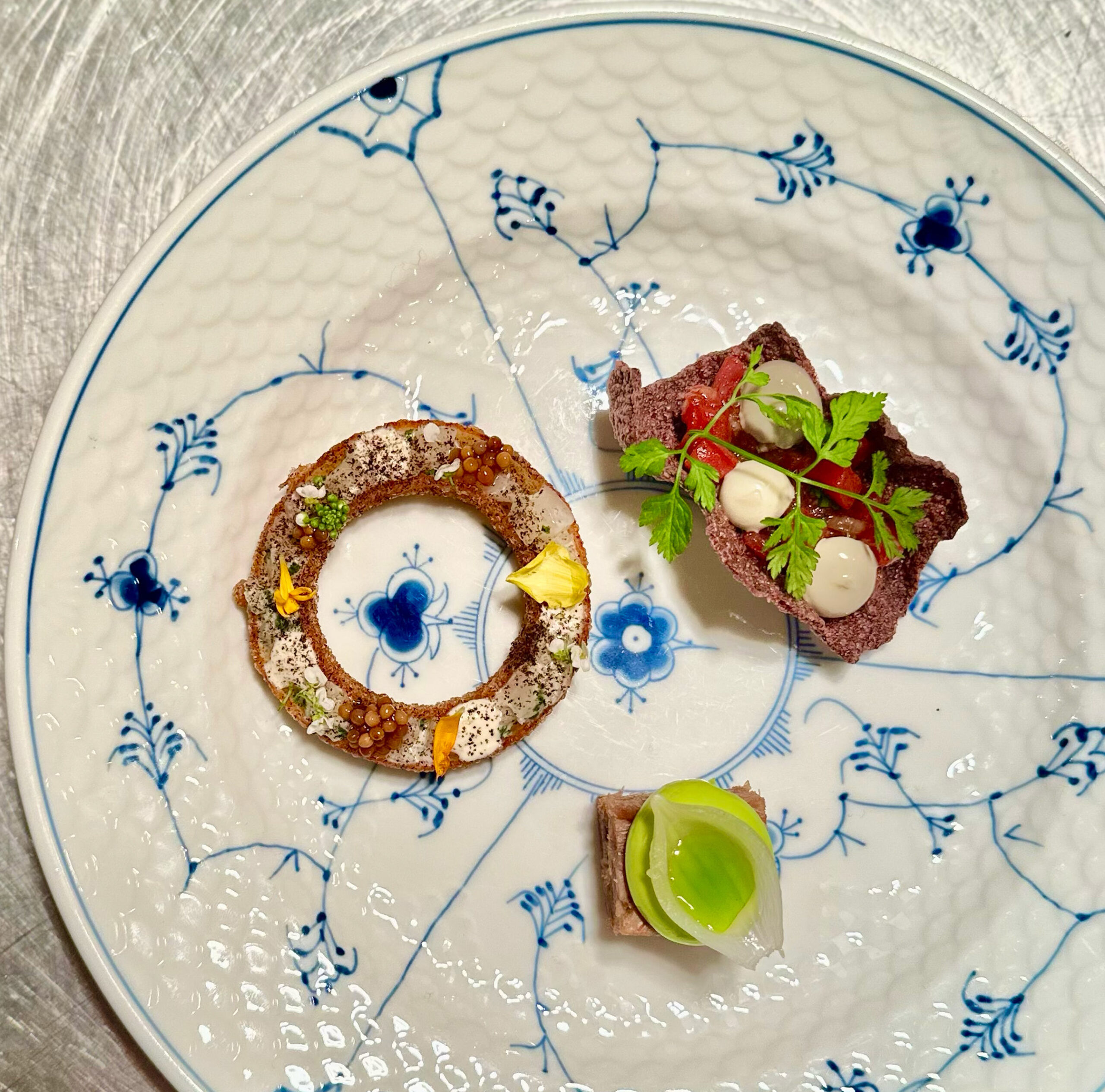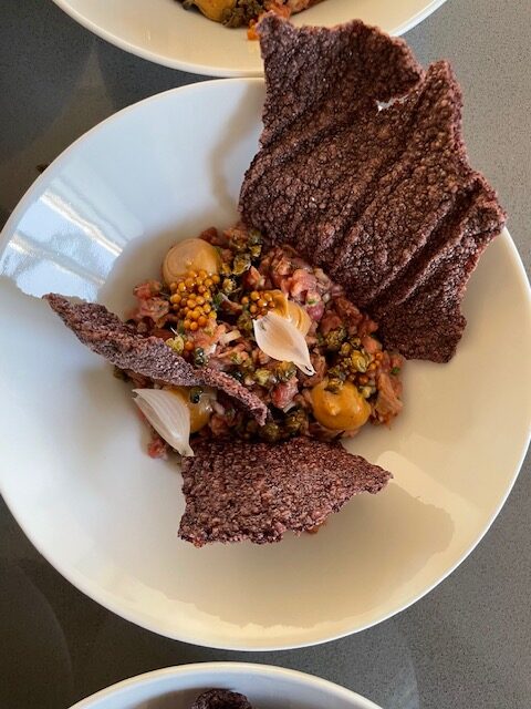 *Oksetatar, syltede sennepsfrø, skalotteløg, purløg, fermenteret peberemulsion, vilde