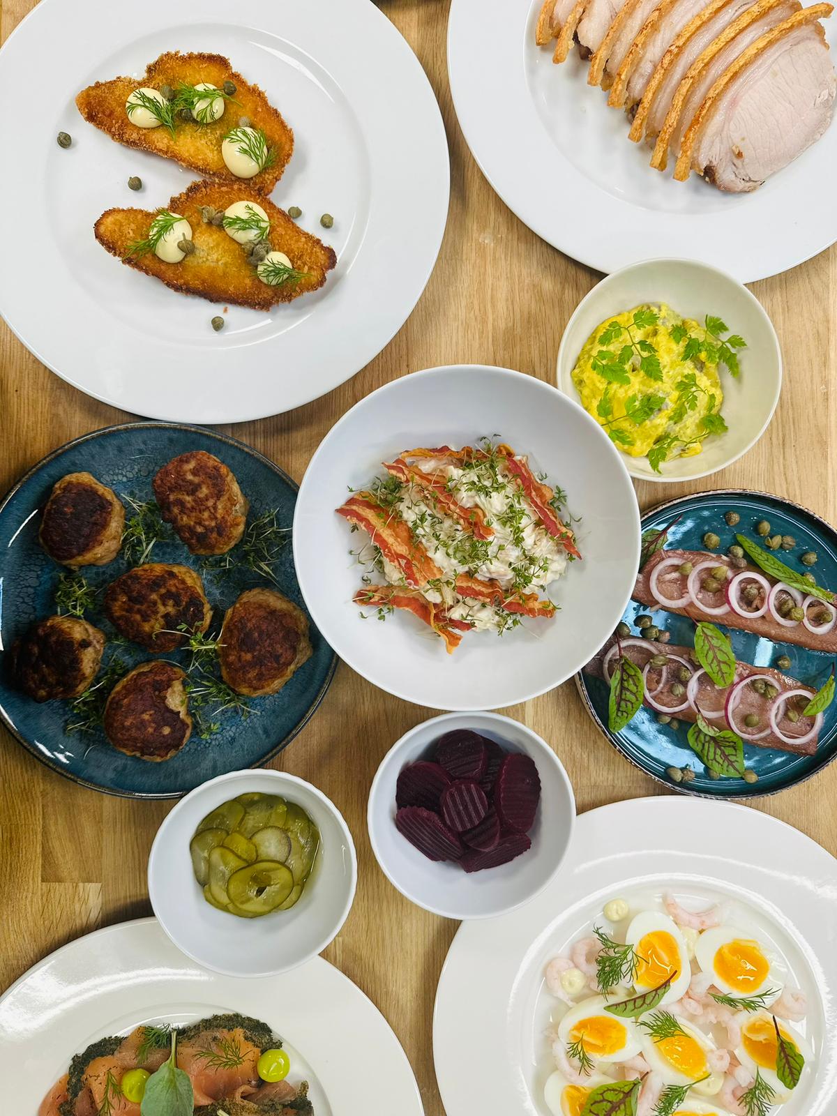 Denne menu er beregnet til en stående middag hvor forskellige retter vil blive vist samtidigt, så gæsterne kan komme til retterne løbende. Vi laver retterne undervejs, så alt vil være friskt til enhver tid.