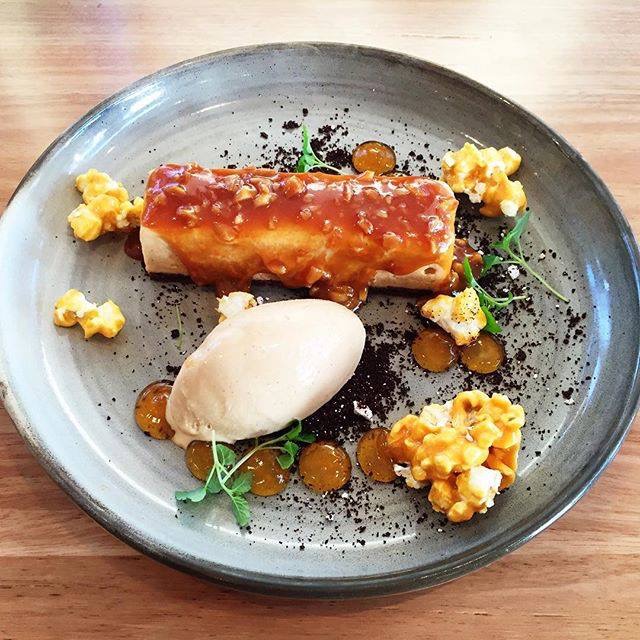*Karamelliseret hvid chokoladeparfait, karamel & jordnøddesauce, vaniljeis, pop corn.