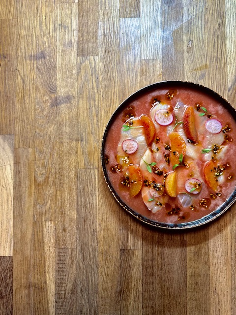 Hamachi-ceviche, blodappelsin & yuzu-dressing, salsa macha, grillede babymajs,