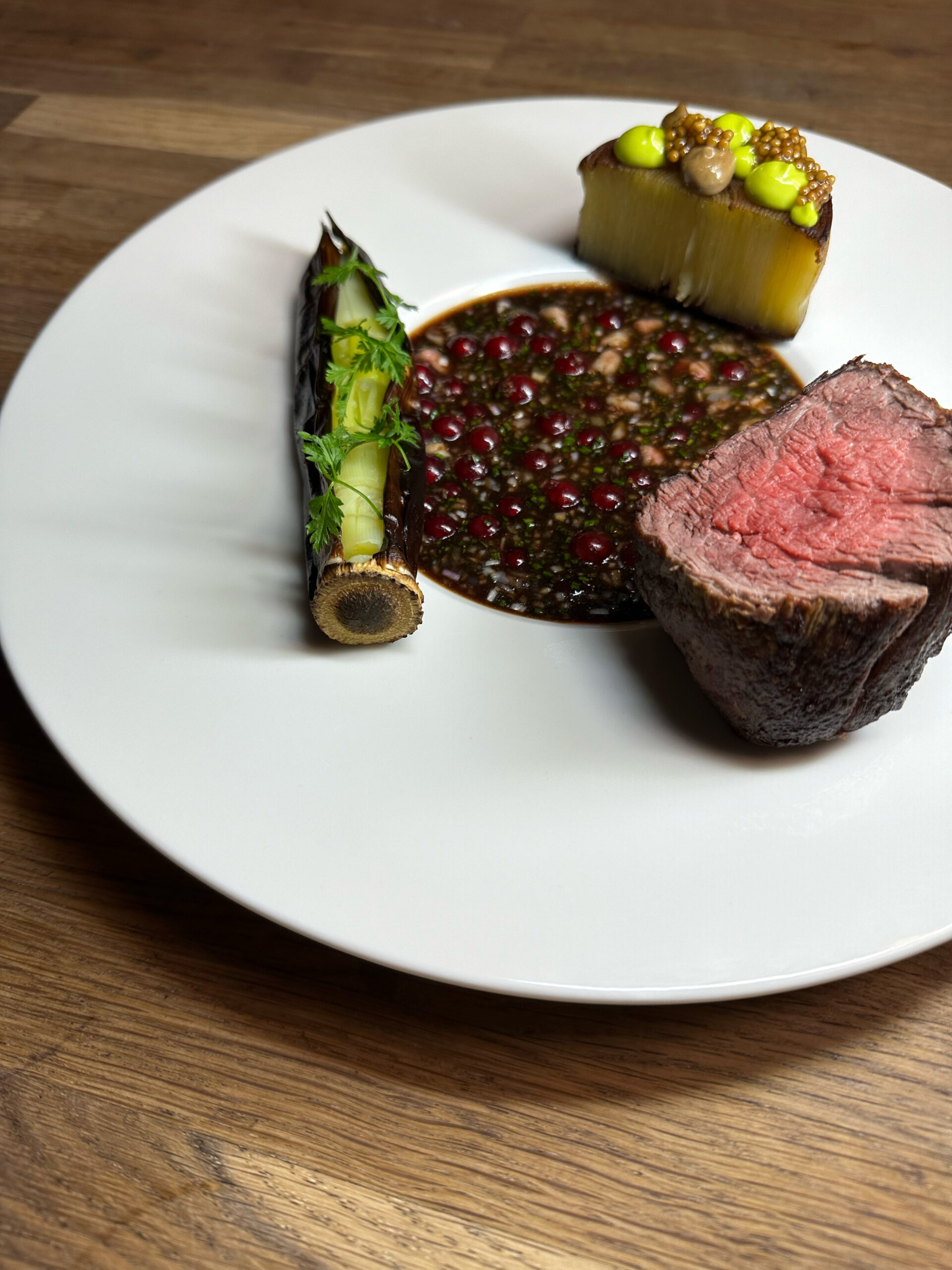 *Ovnbagt oksehøjreb, cremet kartoffelmos, grønne asparges, konfiterede løg. Rødvinssauce